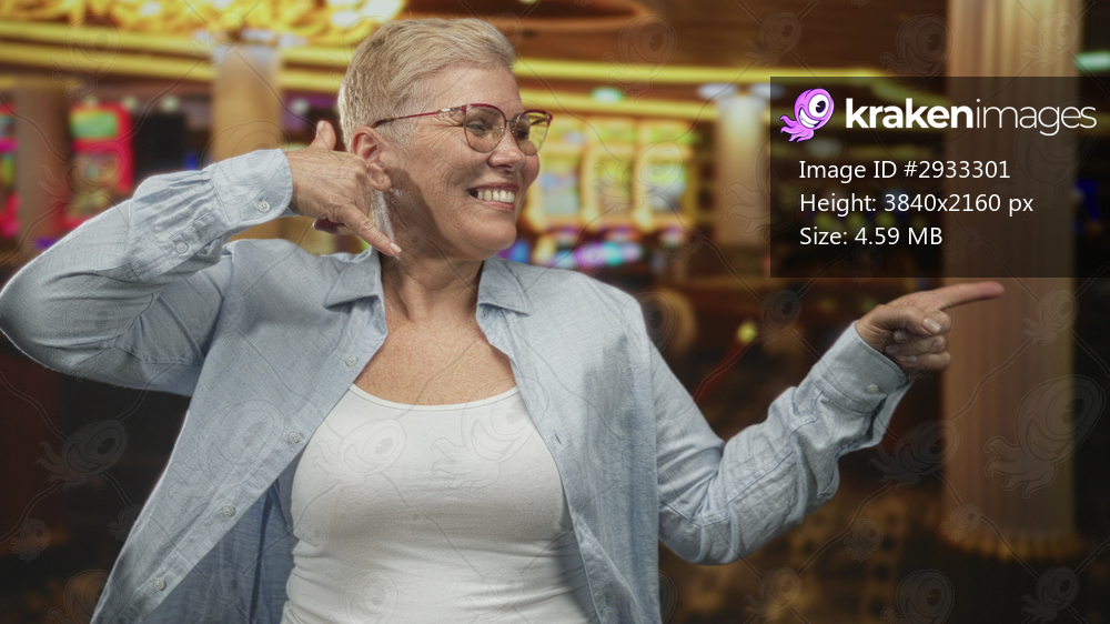 Woman smiling and pointing finger to the right while holding hand at ear like phone in casino; playful winning luck.