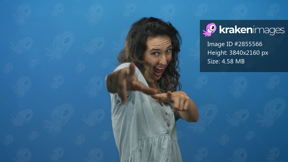 Woman smiling and pointing finger toward camera in studio on blue backdrop wearing denim dress; playfulness.