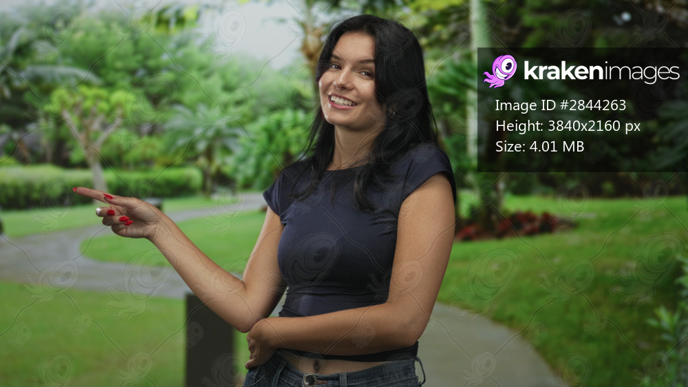 Woman smiling and pointing finger toward horizon on city street walkway under bright daylight; anticipation.