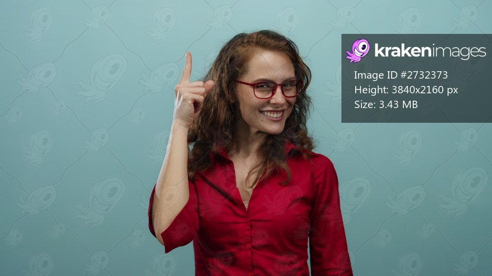Woman smiling pointing finger wearing red shirt against blue background suggesting idea or concept captured isolated over cheerful setting with glasses. - Kraken Images
