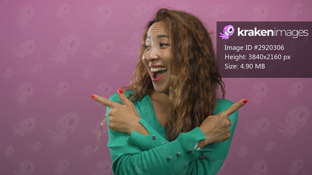 Woman smiling and pointing fingers with crossed arms wearing green sweater in pink studio; joyful playfulness.