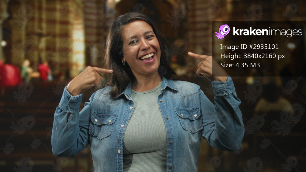 Woman smiling and pointing fingers to chest wearing denim jacket inside an ornate church building with wooden pews; self confidence joy.