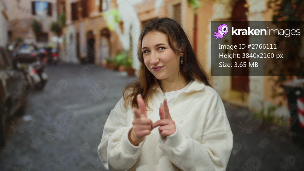 Woman smiling and pointing fingers while standing on a picturesque street in a city with historic buildings and a vibrant atmosphere on a sunny day.