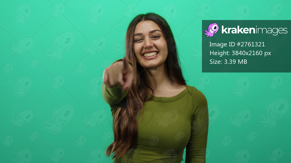 Woman smiling and pointing forward against a vibrant green background conveying confidence and approachability in an isolated cheerful setting indoors with stylish clothing. - Kraken Images