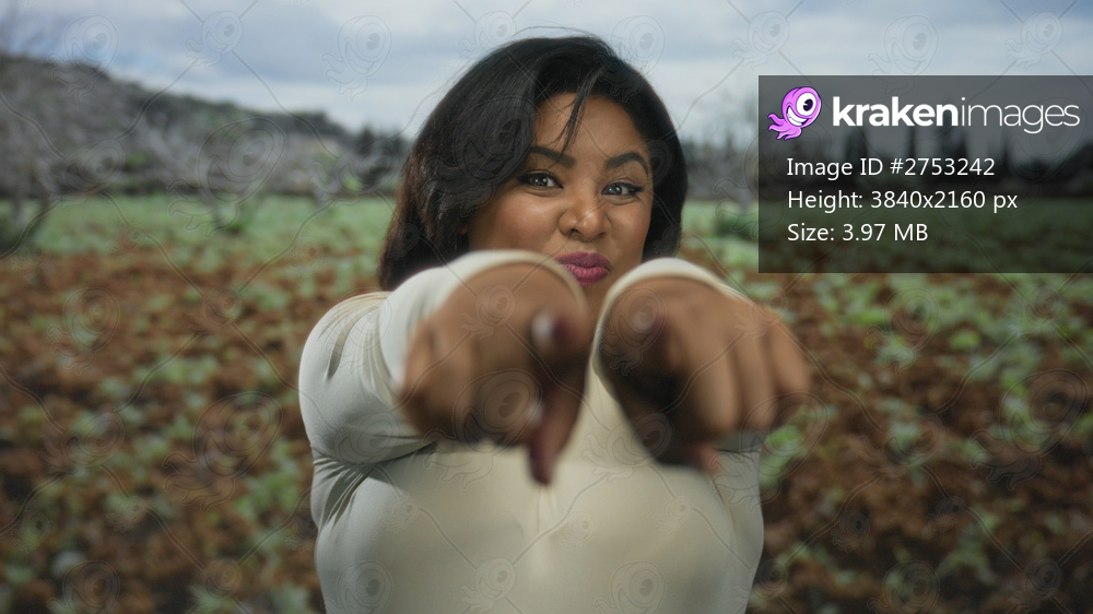 Woman smiling and pointing in a park setting, showcasing a cheerful and playful demeanor against a lush outdoor backdrop, highlighting her youthful and vibrant personality. - Kraken Images