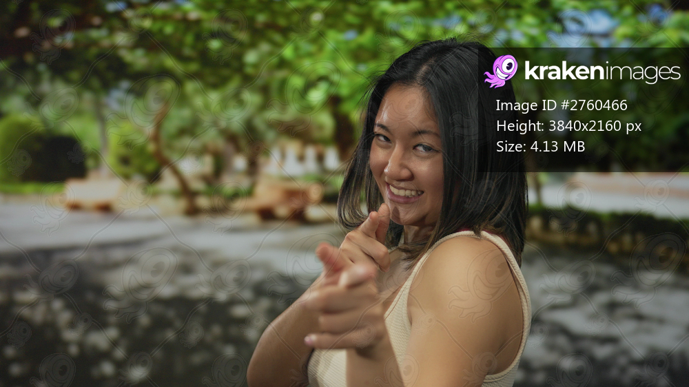Woman smiling and pointing in a sunny park outdoors, surrounded by lush green trees and benches, capturing a vibrant and joyful moment.