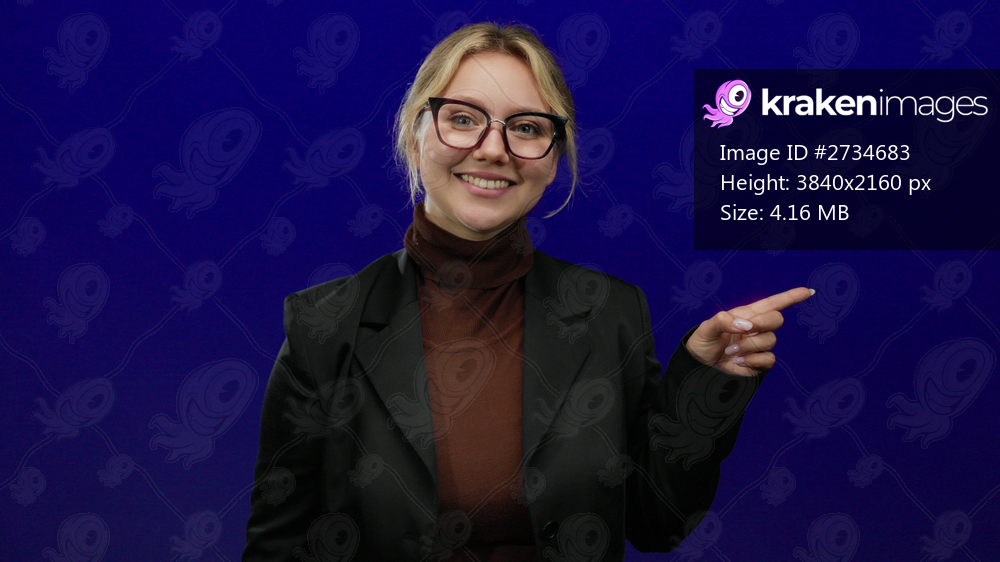 Woman smiling and pointing in business attire against a vibrant blue background, showcasing a confident pose.