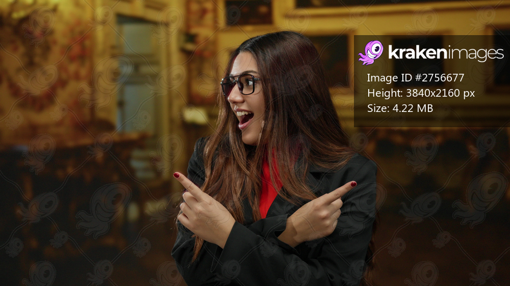 Woman smiling and pointing in elegant museum interior wearing glasses and blazer conveys excitement and curiosity in cultural setting indoor.