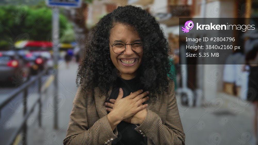 Woman smiling and pointing joyfully on a bustling street with blurred cars and people in the background, embodying happiness and urban life.