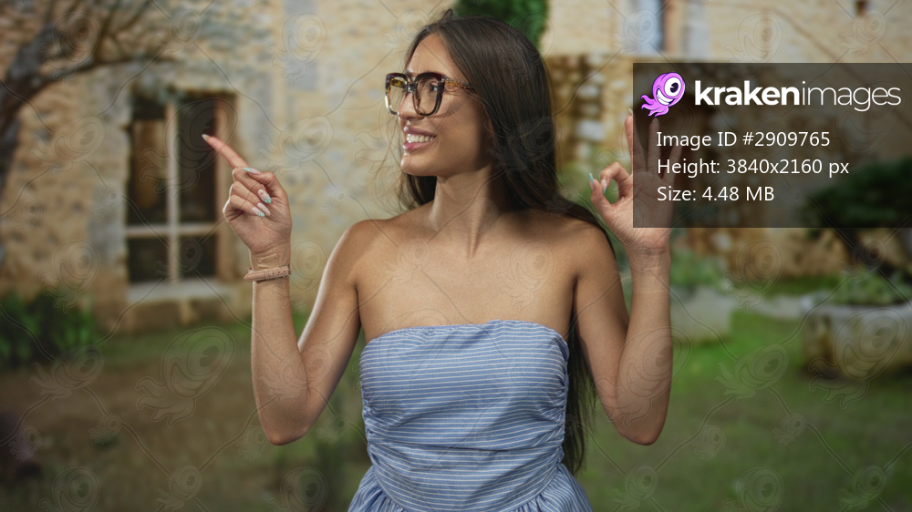 Woman smiling, pointing left and making ok sign with both hands at stone building entrance outdoors near house doorway; friendly welcome joy.