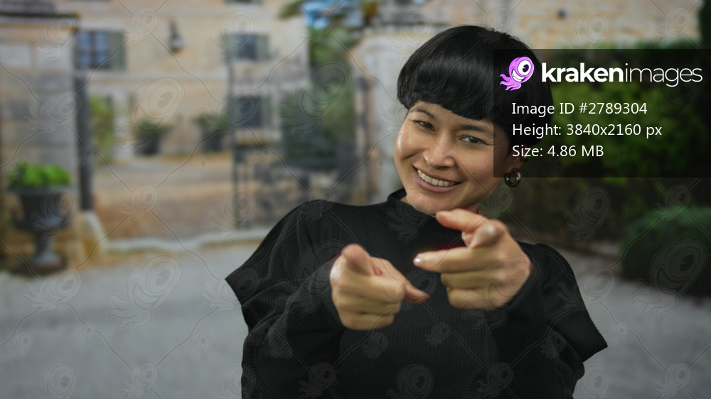 Woman smiling and pointing on a city street, blending a lively atmosphere with playful energy outdoors.