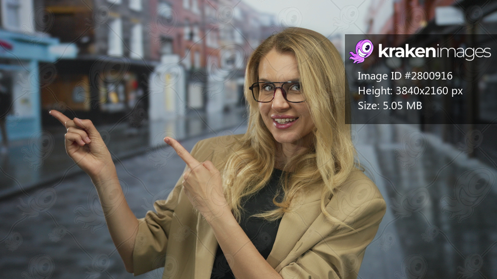 Woman smiling and pointing on a city street, showcasing urban environment with blurred buildings under cloudy weather