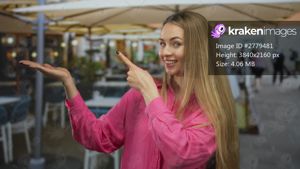 Woman smiling and pointing on a terrace at a restaurant with outdoor seating while wearing a pink shirt, showcasing a lively dining scene and casual ambiance. - Kraken Images