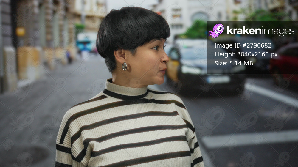Woman smiling and pointing outside on a busy city street with cars in the background.