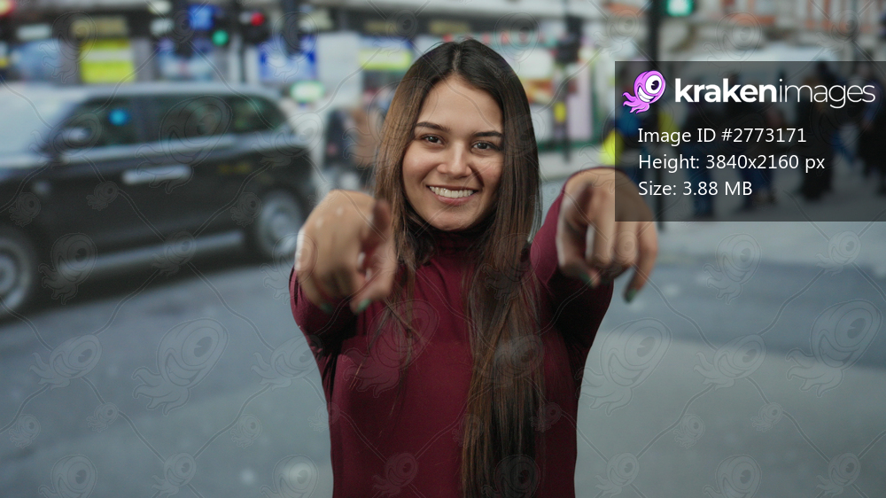 Woman smiling and pointing playfully on a busy city street with blurred pedestrians and vehicles in the background, capturing a vibrant urban outdoor scene. - Kraken Images