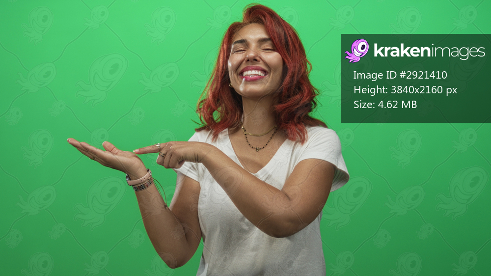 Woman smiling and pointing to an open palm in green studio with red hair and white t shirt, bracelets and rings visible; playful joy.