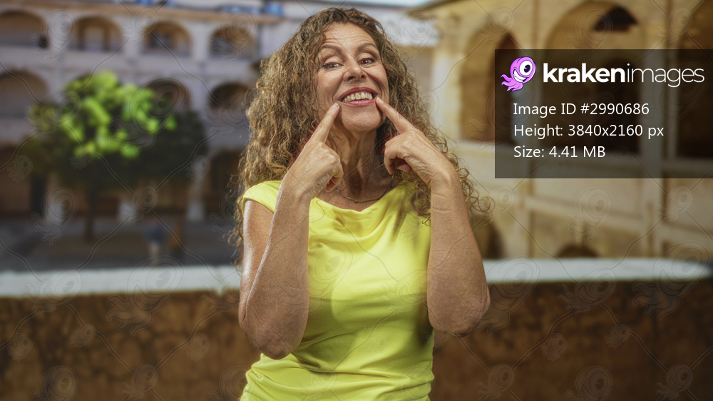 Woman smiling and pointing to her cheeks with hands and fingers raised in a building courtyard, wearing yellow top; joyful playfulness.