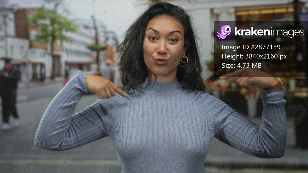 Woman smiling and pointing to knit sweater with finger to chest on a busy city street near flower stall; confidence self identity.