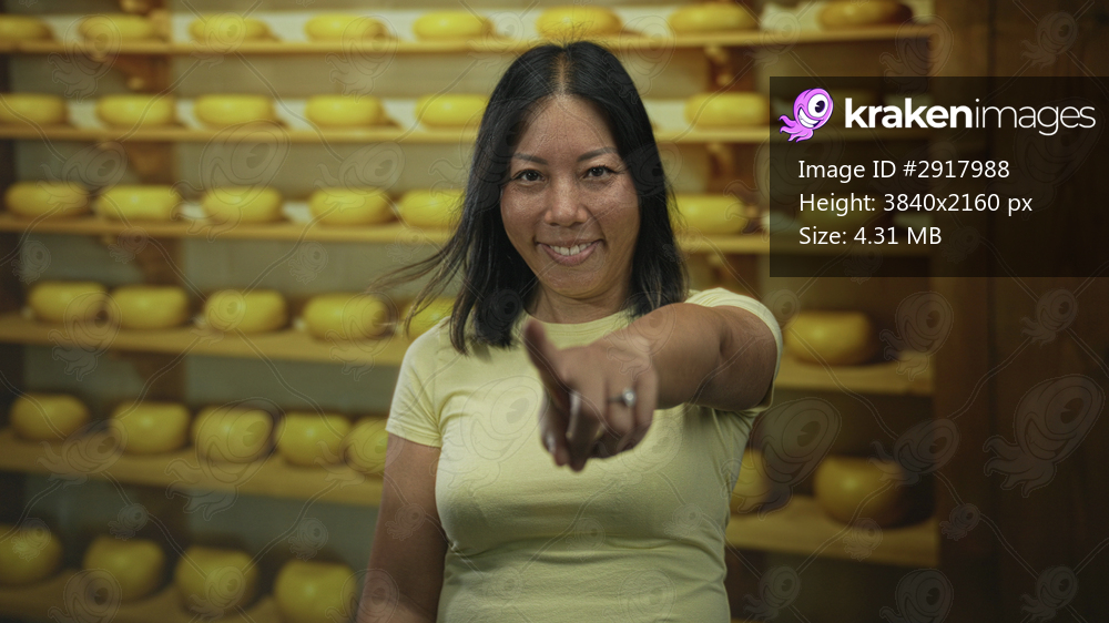 Woman smiling points finger at camera beside shelves of cheese wheels on wooden racks in a building; local food confidence.