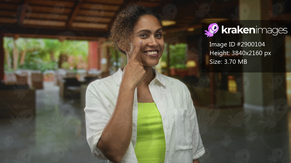Woman smiling and points finger to cheek showing face in hotel building lobby with lime top and white shirt; joy hospitality.