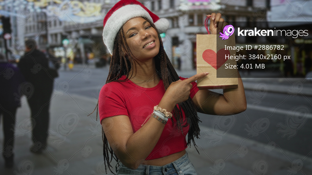 Woman smiling and points finger to kraft paper gift bag on busy city street wearing santa hat and red crop top; holiday cheer.