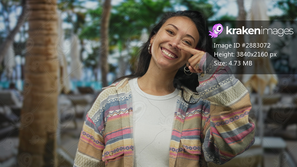 Woman smiling, points finger to nose, wearing hoop earrings and striped jacket in forest with palm trees and umbrellas; playful joy.
