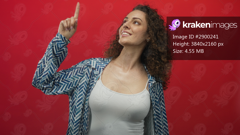 Woman smiling points finger upward in red studio wearing white tank and sleeveless patterned shirt with curly hair; confidence.