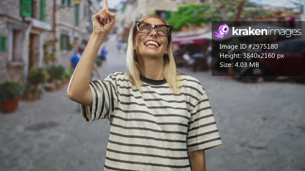 Woman smiling and points index finger up on a cobbled street, middle age blonde wearing striped t shirt and oversized glasses, laughing; joy travel discovery. - Kraken Images