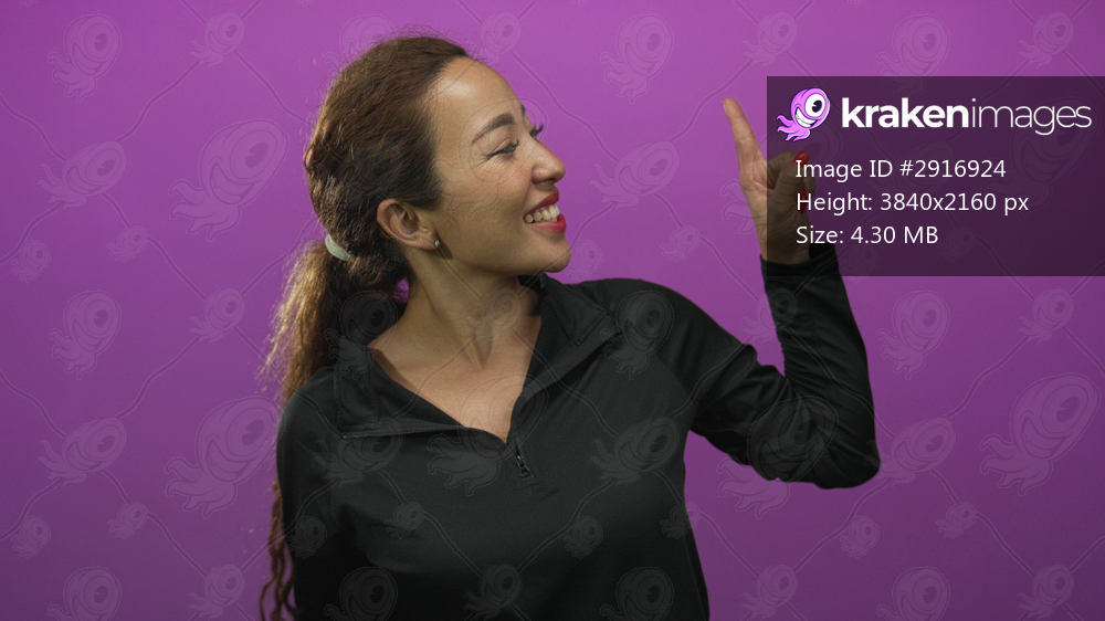 Woman smiling and points index finger up wearing black zip jacket in purple studio; playful confidence.