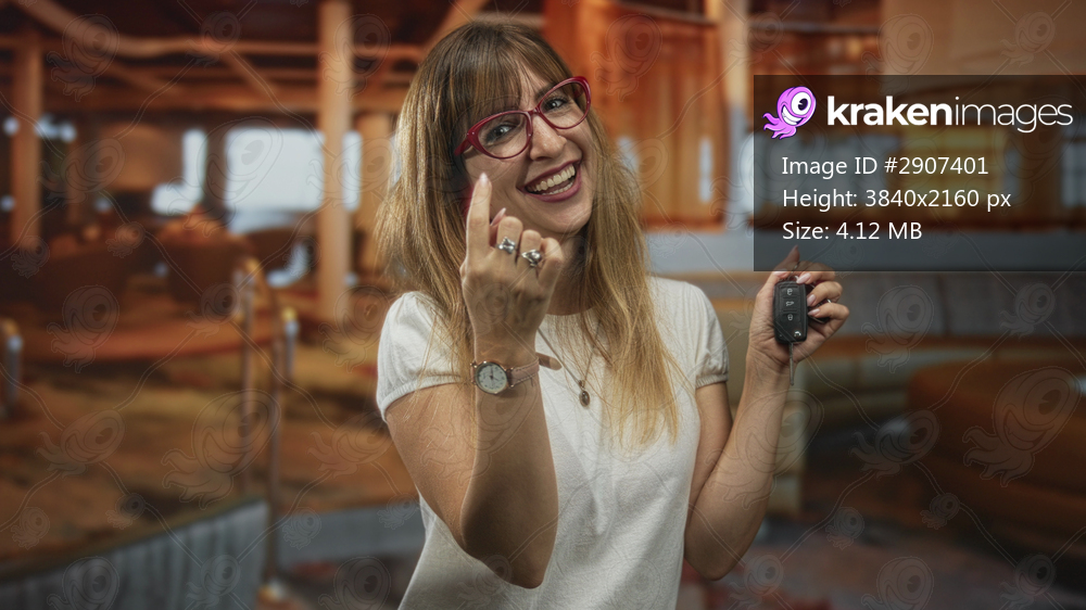 Woman smiling and points index finger while holding car key fob and showing rings with red glasses in restaurant seating area; joy celebration.