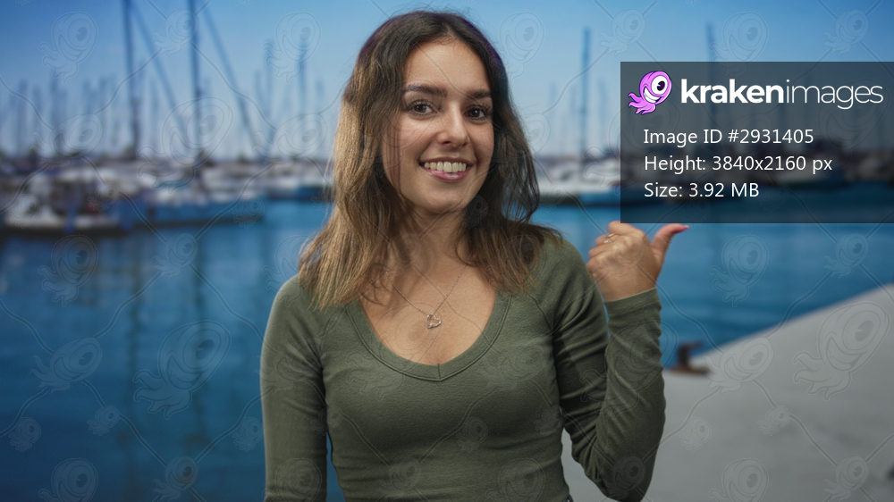 Woman smiling points thumb to boats on a street dock at a port while facing camera; carefree getaway.