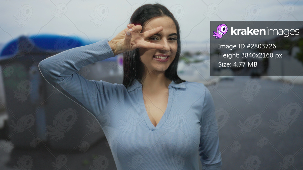 Woman smiling and posing outdoors on a street showing a peace sign with her fingers, wearing a blue shirt, conveying happiness and joy in a casual urban setting. - Kraken Images