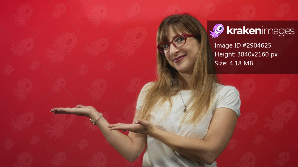 Woman smiling and presenting open hands in studio with vivid red backdrop, wearing white tshirt, red glasses and pendant; friendly invitation.