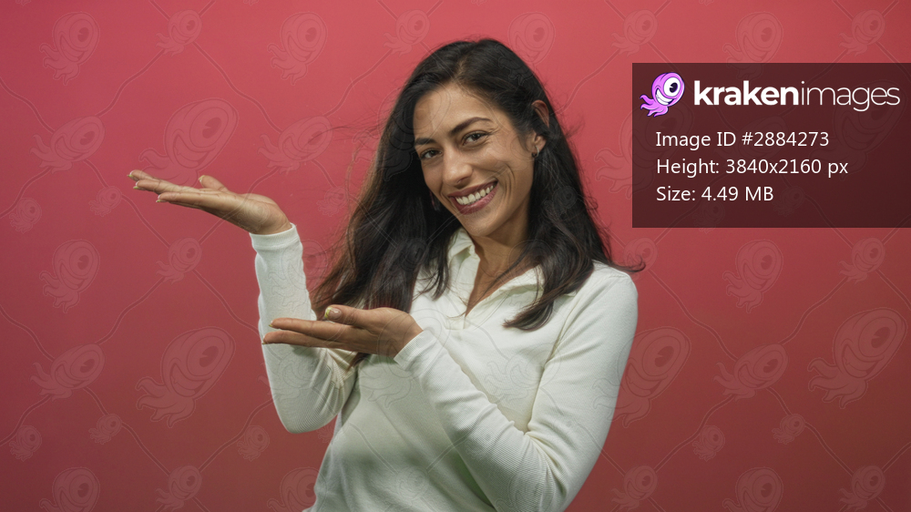 Woman smiling and presenting with open palms, wearing a white polo top and gold earring while posing in a pink studio; joy.