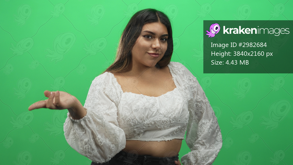 Woman smiling and presenting palm up hand, touching temple in other frames, wearing white embroidered crop top with exposed midriff against green screen studio; friendly confidence. - Kraken Images