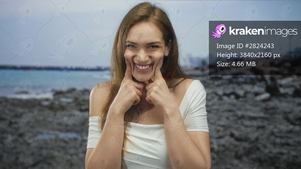 Woman smiling and pressing cheeks with fingers on sunlit sandy rocky shoreline at seaside; carefree joy.