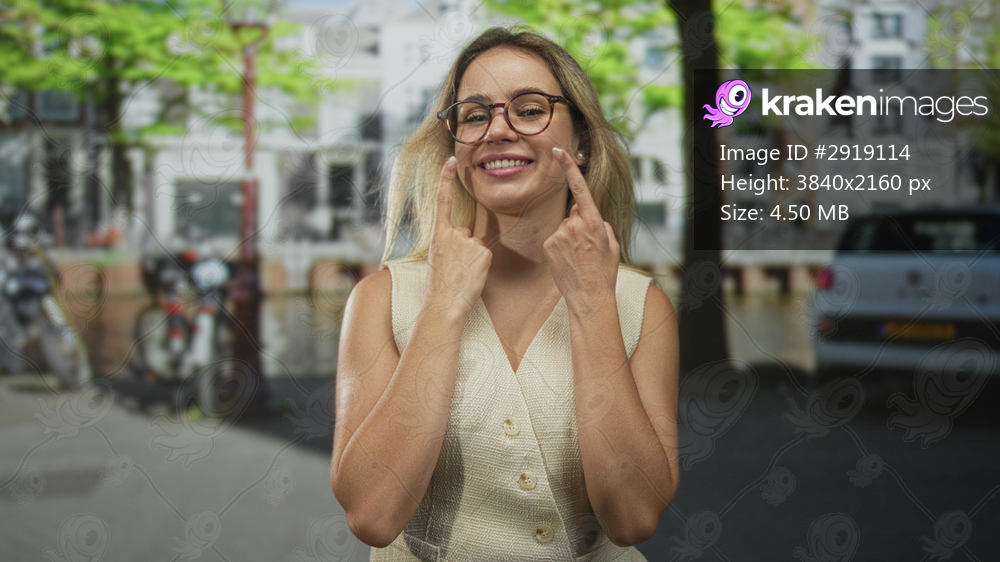 Woman smiling and pressing index fingers to cheeks on a street canal with parked bikes and car nearby; playful joy.