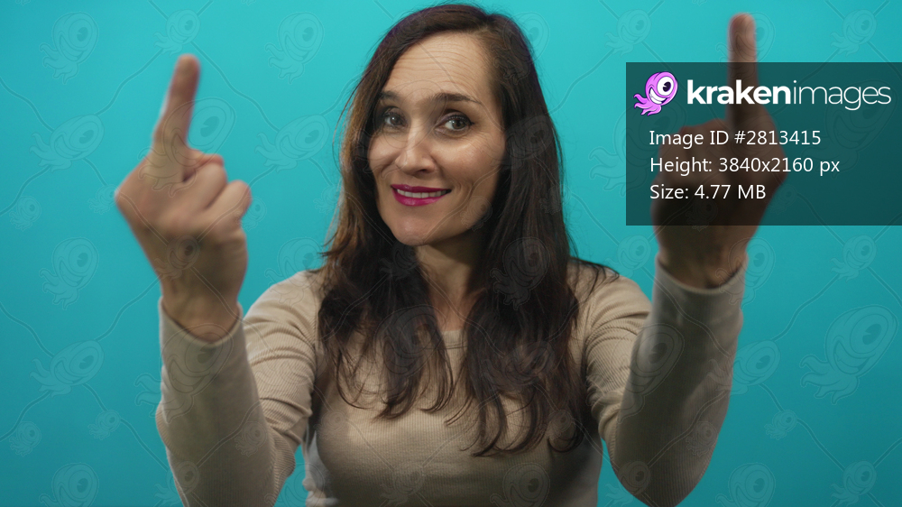 Woman smiling with raised arms against isolated blue background conveys sass and defiance, emphasizing bold gesture and vibrant atmosphere.