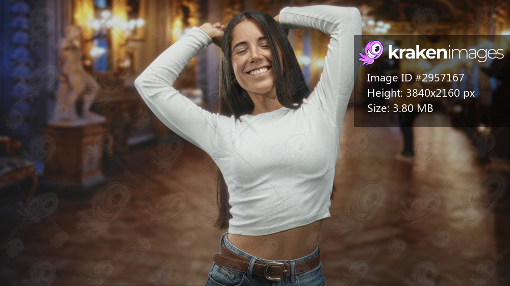 Woman smiling raises arms showing midriff in ornate museum building with chandeliers and statues; joy carefree celebration.