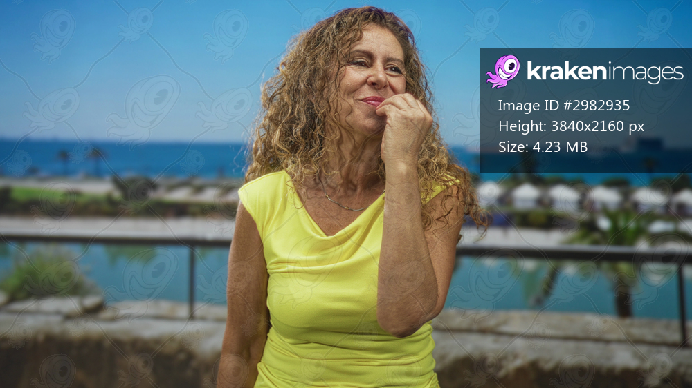 Woman smiling and raising hand in a pinched fingers gesture, wearing yellow sleeveless top and necklace on a studio seaside set; joyful.
