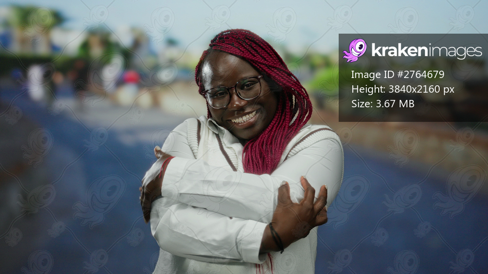 Woman smiling with red braids embraces herself outdoors in a vibrant city street displaying joy and confidence in the urban environment.