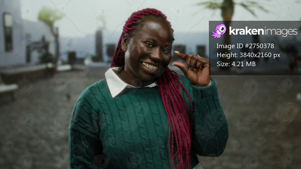 Woman smiling with red braids in an outdoor city street, making a small gesture, wearing a green sweater, palm trees in the background implying a vibrant urban setting. - Kraken Images
