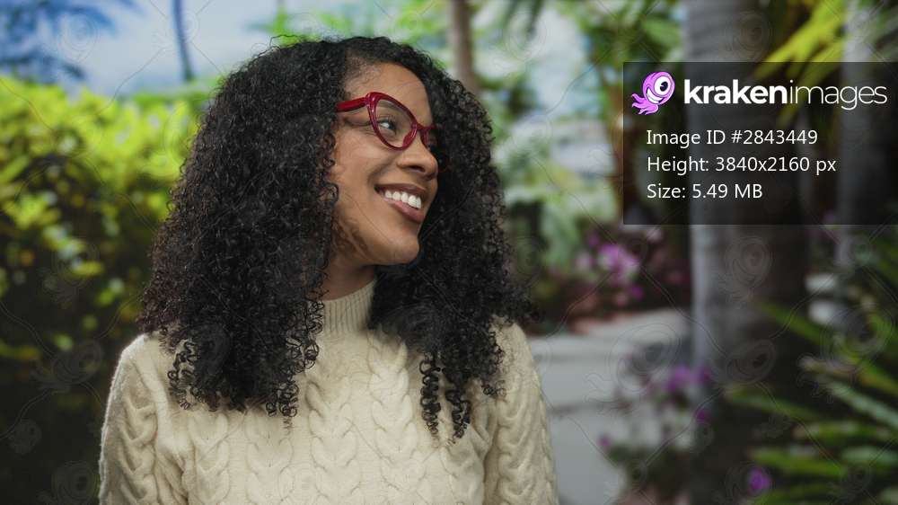 Woman smiling with red glasses and cream sweater among lush green palm trunks and flowering shrubs in forest; serenity contentment joy.