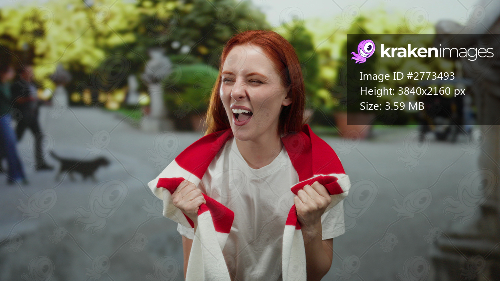 Woman smiling with red hair and scarf on city street with lush trees, embodying youthful joy and urban exploration in a vibrant outdoor scene.