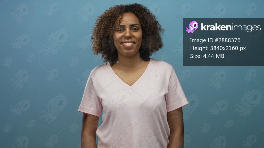 Woman smiling with relaxed posture and exposed collarbone wearing pink v neck tee in a blue studio, facing camera; contentment poise.