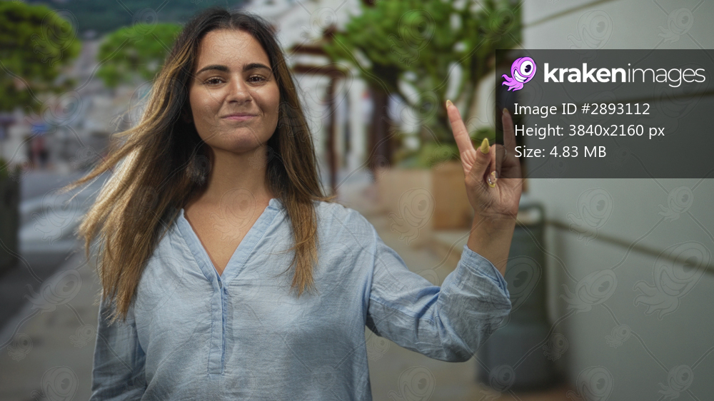 Woman smiling with right hand showing rock horns gesture on a city street beside planter and trashcan near storefront; joy fun casual.