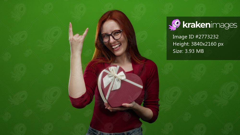 Woman smiling with rock gesture holding heart shaped gift box against green background showcasing youthful style.