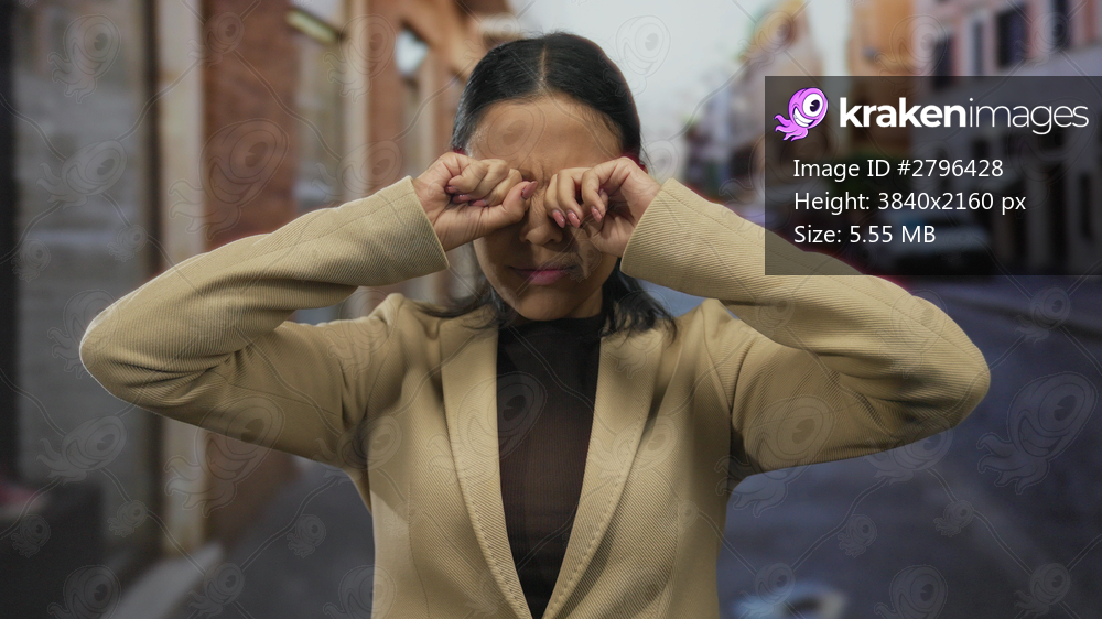Woman smiling and rubbing eyes on a lively urban street, conveying surprise and joy, dressed in a beige blazer, embodying youthful enthusiasm in a vibrant outdoor setting. - Kraken Images