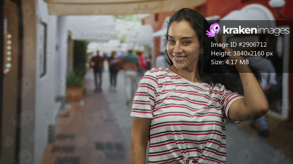 Woman smiling and running her hand through hair on a busy pedestrian street lined with shops and canvas awnings, wearing a striped knotted tee; carefree moment. - Kraken Images