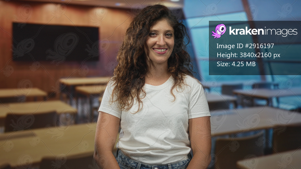 Woman smiling seated at a desk showing face and wearing a white t shirt in a classroom with large windows and wooden paneling; approachable confidence. - Kraken Images